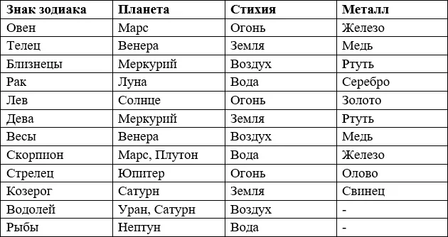 Таблица № 3. Знаки зодиака и планеты, стихии, металлы, которые им соответствуют