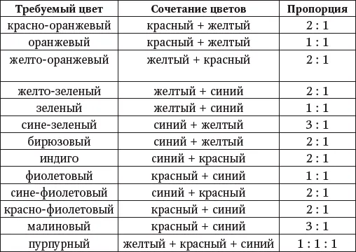 Иногда не все цвета, требуемые для оказания целебного физического и духовного воздействия, можно получить, например при отсутствии нужных красок, цветной бумаги и т. д. В таблице ниже приведены возможные сочетания основных цветов спектра, при смешивании которых можно добиться желаемых переходных оттенков.