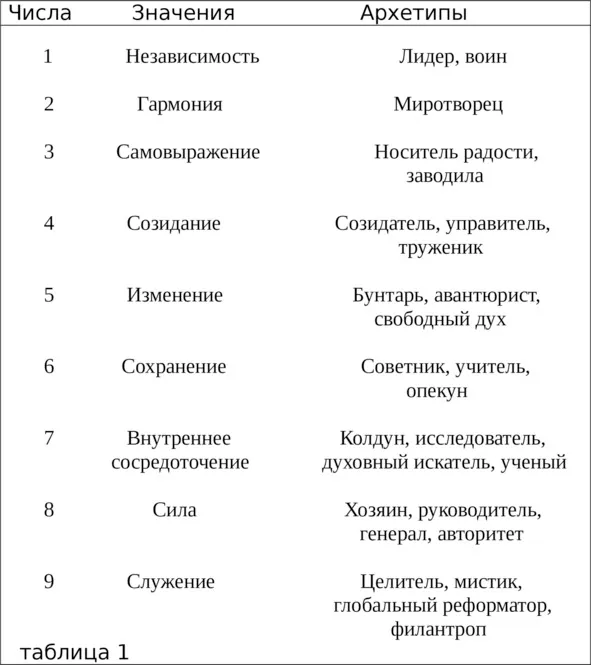 Поскольку числа от 1 до 9 – это основные числа нумерологической системы, значение каждого из которых можно рассмотреть в терминах архетипов (таблица 1).