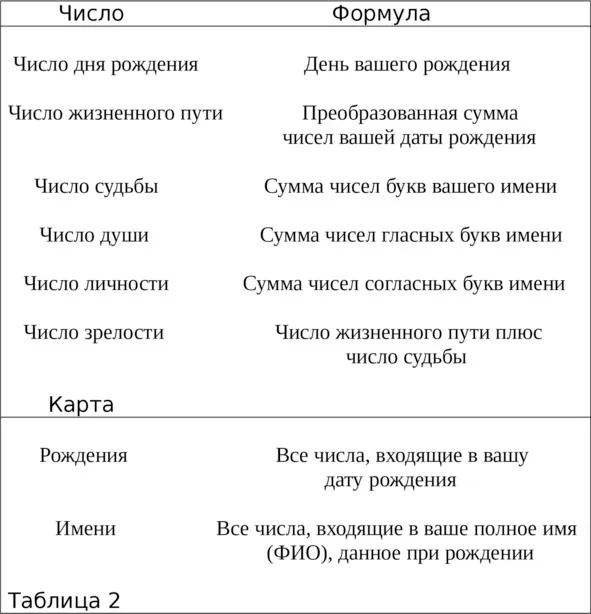 Числами наполнена не только дата вашего рождения, но и ваше имя, которое тоже может быть представлено числами, рассказывающими историю вашей жизни. Ваш так называемый нумерологический портрет состоит из множества чисел. Самые значительные из них называются основными числами (таблица 2).