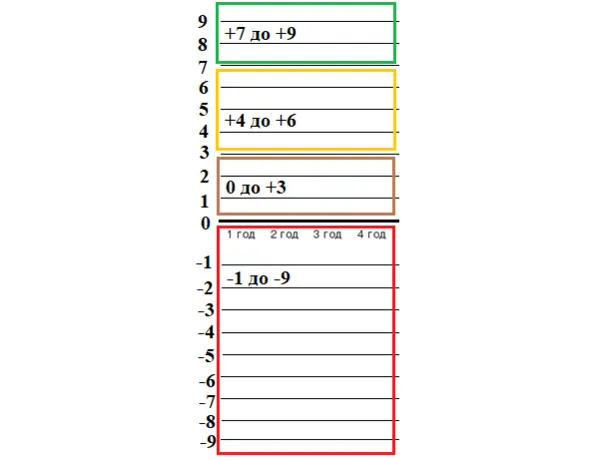 Если график находится ниже оси: это предвестник кризиса и застоя, человеку не интересно реализовываться в данной сфере, у него не получается, вдохновение покидает его. Крайне неблагоприятная зона. В такие периоды окружающие все время отвлекают, не дают сосредоточиться, запутывают, в целом очень некомфортная зона. Человек чувствует потерянность себя, он не знает, куда идти и что делать. Появляется чувство пустоты и безысходности. Включаются страхи: чаще всего страх одиночества и смерти. Проявляются вредные привычки, падает иммунитет, и приходит болезнь. Притягиваются негативные обстоятельства, потеря финансов. Страдают все сферы жизни. Предательство близких, друзей и знакомых. Вам ставят палки в колеса. Постоянно какая-та суета и хлопоты. Также человек теряет музу, вдохновение и удачу.