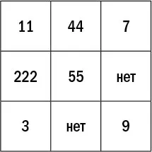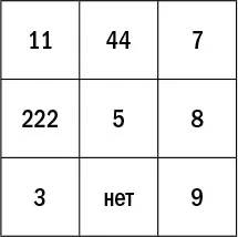 Пояснение: вторая строка создает цифру 5, но не создает цифру 8; второй столбец создает цифру 5, но не создает цифру 6; духовная диагональ создает цифру 9, но не создает цифру 5.