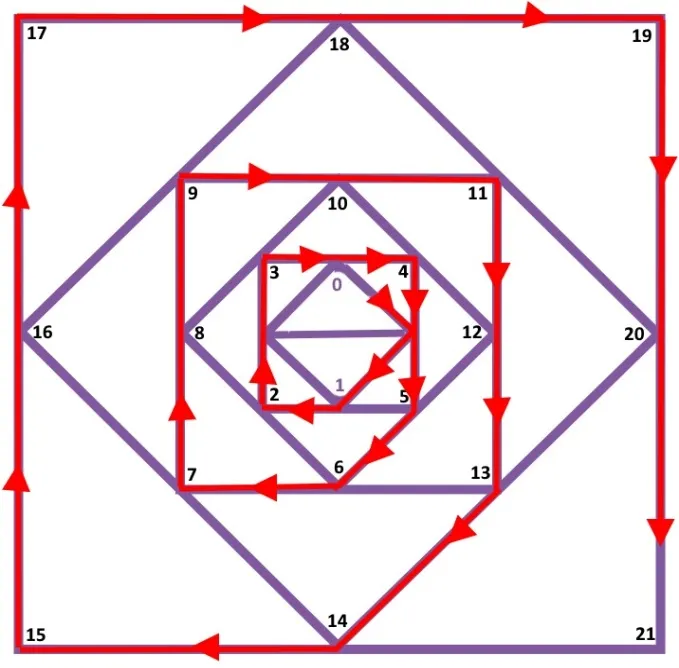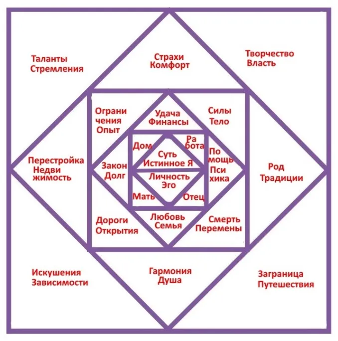 Схематично Спираль Судьбы – это шесть квадратов, вписанных друг в друга, разделённых на сегменты (треугольники).