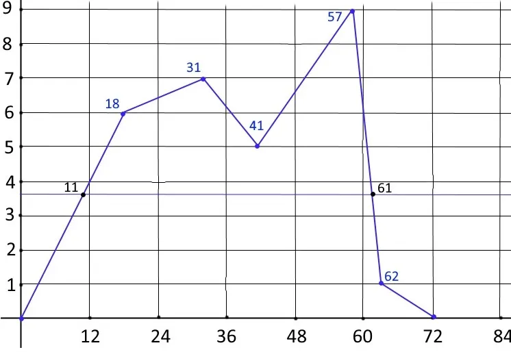 На горизонтальной оси находим возраст (нижняя строка таблицы), а на вертикальной оси балл, соответствующий этому возрасту (средняя строка таблицы).