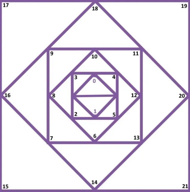 Схематично Спираль Судьбы – это шесть квадратов, вписанных друг в друга, разделённых на сегменты (треугольники).
