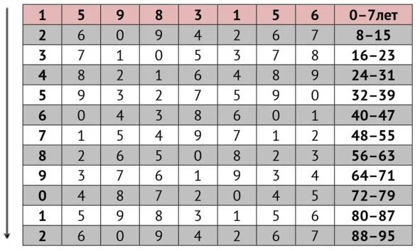 Пример: Ирина, имя состоит из пяти букв, т. е. каждый цикл будет равен пяти годам. Год солярный.