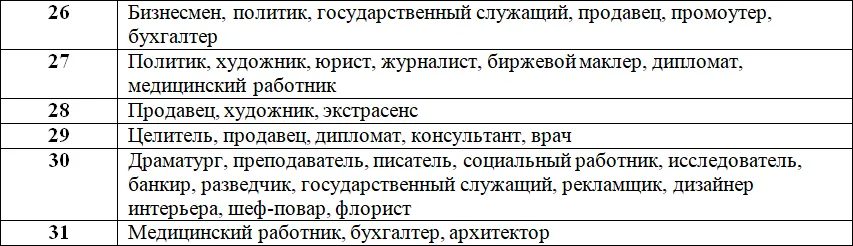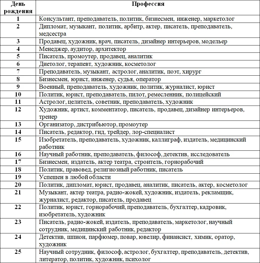 Призвание. Человек с числом 1 долгое время не привержен какой-либо профессии. Он может служить в армии, работать дизайнером, государственным служащим, хирургом, ювелиром, электриком, исследователем, лесничим, фотографом, геммологом, продавцом, промоутером, политиком, учителем, фермером и консультантом.