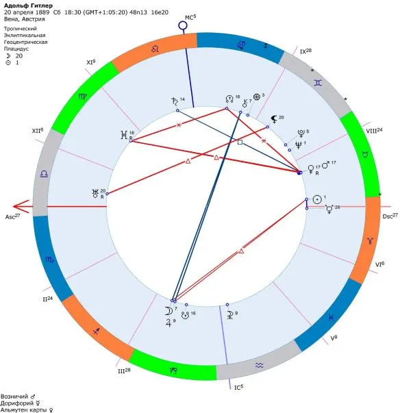 Чтобы углубиться в анализ аспектов Лунных узлов, нужно досконально знать биографию Адольфа. Такими знаниями я не обладаю, но, если вы в себе более уверены, предлагаю присоединиться к анализу.