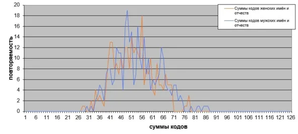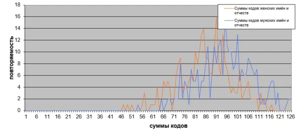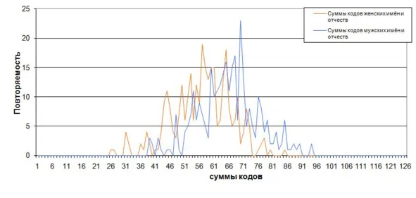По оси абсцисс графика «СД-модель Л. Болотовой» (рис. 7) запечатлены коды современных имён-отчеств россиян в оцифровке по системе А. Киселя [47] (Приложение 1). По оси ординат – повторяемость кодов в соответствии со справочником имён Б. Хигира [74].