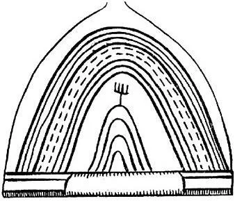 Изображение Вселенной, в том числе нескольких небес, Мировой горы и Мирового древа на ней. Эпоха неолита. Средиземноморье (по В. Евсюкову)
