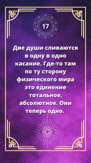 Толкование: Каждому суждено найти, как у нас принято говорить, свою вторую половинку. Конечно, каждый из нас целый и даже больше – полноценный человек и никто из нас не становится лучше или хуже, если он с кем-то или если он один. Только два полноценных человека способны создать настоящий союз в Любви. Настоящая Любовь – это единение душ, а не тел. Об этом сутра.