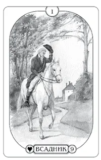 Общее значение. На карте Всадник мы видим молодого человека, который уверенно восседает в седле и куда-то держит путь. Он целеустремлен и точно знает, куда направляется. Карта наполнена энергией и указывает на движение, будь то поездка или же получение известий. Во время зарождения Оракула Ленорман всадник в гражданской одежде зачастую был почтальоном, он привозил не только письма и послания, но и разного рода новости, сплетни, оживлял будни свежим потоком информации. Характер новостей нам подскажут другие карты: Всадник – Солнце: радостные известия, которые принесут ясность в ситуацию; Всадник – Тучи: неприятные известия, которые испортят настроение и внесут неясность и сумятицу.