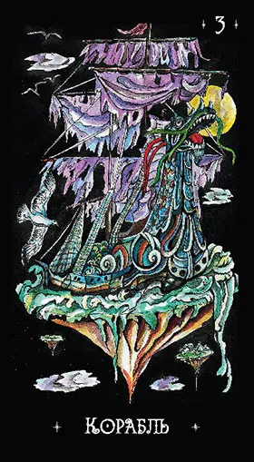 Корабль – это очень позитивная карта, она всегда меняет жизнь к лучшему. Паруса у корабля порваны, они со временем обтрепались, но судно не перестает двигаться вперед и менять нашу жизнь к лучшему. Сиреневый цвет указывает на связь с космосом и высшими силами, которые всегда направляют нас в верное русло. Нам только нужно прислушаться к внутреннему голосу, к своему сердцу, и все сразу же встанет на свои места. Корабль – символ невесомости. Не понятно, двигается он или стоит, но он устремлен вперед по воле божьей, несмотря на порванные паруса.