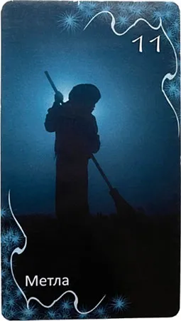 На карте мы видим на темно-синем фоне силуэт в капюшоне, с метлой в руках. Двоякая карта. С одной стороны, негативная: говорит о сплетнях, конфликтах. Несет в себе ссоры и потери, негативные перемены. Конфликты, которые могут причинить боль.
