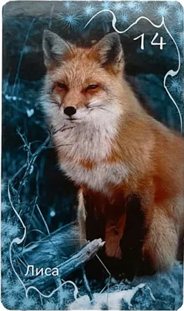 На карте мы видим лисицу в снегу, которая смотрит вперед недобрым прищуренным взглядом. Здесь изображен совсем не животный взгляд, хитрый и дерзкий.