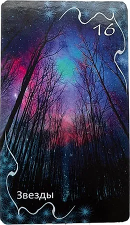 На карте видим голые высокие деревья и небо со множеством звезд. В давние времена звезды были путеводителем для мореплавателей, ориентиром, звездной картой. Несет позитивное масштабное значение. Эта карта означает мечты, надежду на лучшее. Воплощение задуманного в жизнь. Это именно реализация ваших планов и намерений. В ином прочтении говорит об астрологии, магии.