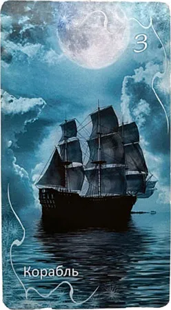 Положительная карта. На карте мы видим корабль под парусами, он плывет по воде. Имеет свой курс и маршрут. Борется с волнами и имеет цель, куда плыть. Берега не видно. Вода ассоциируется с эмоциями.