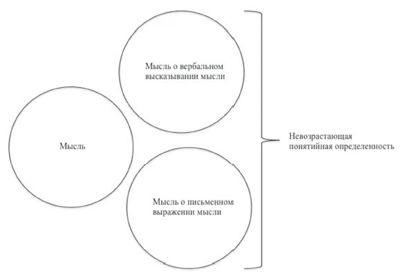 Данное представление является, однако, ошибочным из-за того, что оно пренебрегает неизбежной ролью неповторимой понятийной концептуализации при интерпретации словесных понятии. Дело в том, что вербальное высказывание и письменное выражение не являются раз и навсегда данными понятийными полями, а интерпретируются мыслью, как мыслью о вербальном высказывании мысли, и мыслью о письменном выражении мысли, при том что понятийная определенность, двигаясь от концептуального понятия до письменного выражения концептуального понятия, не возрастает. Все эти три понятийных поля составляют не две части внутри одной всеобъемлющей мысли, а образуют три разные понятийные сферы, номинально объединенные одной мыслью, что иллюстрируется следующей схемой: