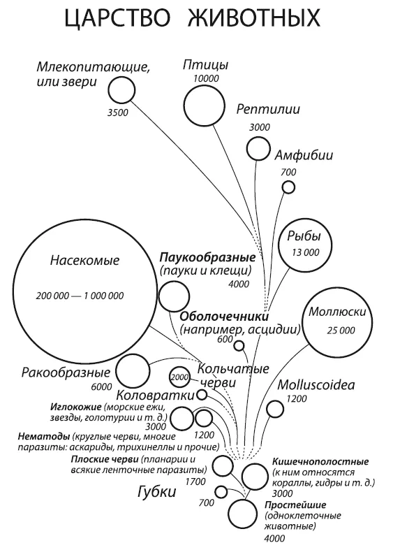 Рис. 5. Царство животных. Число видов, принадлежащих каждой ветви классификации, указано ориентировочно по «Начальному курсу зоологии» Т. В. Галловэй