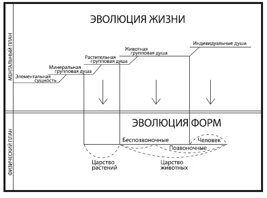 Если данные современной науки, полученные при изучении эволюции форм, значительно расширили и скорректировали наше представление о вселенной, то изучение эволюции жизни приводит к еще более потрясающим выводам. Здесь появляются новые элементы усложнения, и их рассмотрение приводит к переоценке эволюционных процессов. Первый такой элемент заключается в том, что внутри форм, рассматриваемых учеными, существуют несколько параллельных линий эволюции жизни, и каждая из них в значительной степени независима от других в своем развитии. Две из них – человеческая линия и параллельная ей дэвическая, или ангельская, линия эволюции (рис. 8).