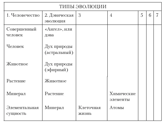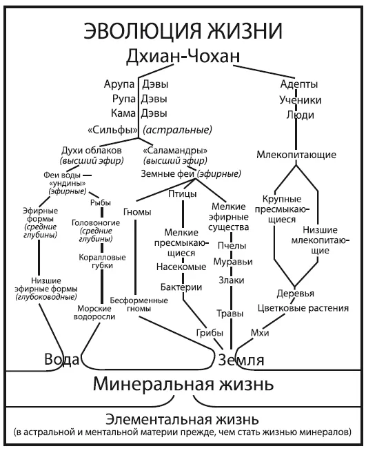 Жизнь использует организмы из твердой, жидкой и газообразной материи, но наряду с этим она использует формы и из более тонкой материи в ее «четвертом состоянии» (теософы называют такое состояние «эфирным»), а также из более разреженных типов материи – астральной и ментальной. Начиная с минералов выделяются шесть разных линий эволюции, сходящихся к двум вершинам – Адептам, или Совершенным Людям, и к Арупа Дэвам, или Совершенным Ангелам, а они в конечном итоге сливаются в один тип высоких сущностей, называемых Дхиан-Чоханами. Из этих шести только две линии используют физическую материю в ее более тонком, или эфирном, состоянии (1-я и 3-я колонки диаграммы) и затем выстраивают формы из астральной материи, такие как «сильфы». Одна линия создает организмы, живущие в воде, в то время как другие используют формы, обитающие на суше. И только одна из шести линий ведет к человечеству, другие пять уходят в параллельную линию эволюции дэвов, или ангелов.