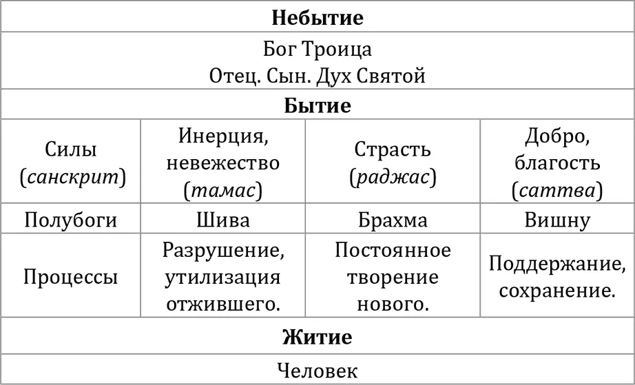 Мир постоянно обновляется, поддерживается и разрушается (смотри таблицу ниже). Это касается бытия. Проявленным миром, т. е. житием, Бог управляет через тех, кто имеет проявленные плотные тела в этом мире, т. е. через человека. Поэтому в сказках пишут «жили-были». Так пишут про тех людей, которые живут и управляют материальным миром, а также бывают, т. е. контактируют с тонкоматериальным миром.