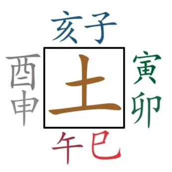 Земля стоит в четырех Земных ветвях и пять стихий в равной степени опираются на нее, поэтому: Сы и Ю 巳酉 соединяются с Чоу 丑 в структуру Металл. Шэнь и Цзы с Чэнь 辰 в структуру Воды. Хай и Мао 亥卯 с Вэй 未 в структуру Дерева. Инь и У 寅午 с Сюй 戌 в структуру Огня. Металл порождает Воду, Вода порождает Дерево, Дерево порождает Огонь, Огонь порождает Землю, Земля порождает Металл и так пять элементов порождают друг друга бесконечно.