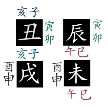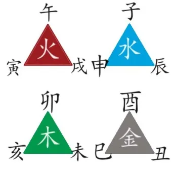 Таким образом, между Хай и Цзы 亥子 стоит одна земная ветвь Чоу 丑 и после соединяет с Инь и Мао 寅卯. Между Инь и Мао 寅卯 стоит Чэнь 辰, который и соединяет их с Сы и У 巳午. За Сы и У 巳午 стоит Вэй 未 и соединяет их с Шэнь и Ю 申酉. За 申酉 стоит Сюй 戌 и соединяется их с Хай и Цзы 亥子.