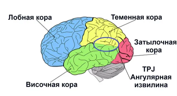 TPJ или височно-теменное соединение – это область мозга, где встречаются височная и теменная доли, призадний конец боковой борозды (сильвиева щель). TPJ включает информацию от таламуса и лимбической системы, при этом она интегрирует данные от зрительной, слуховой и соматосенсорной систем в одно единое сенсорное целое. TPJ также объединяет информацию, как из внешней среды, так и изнутри тела. TPJ отвечает за сбор всей этой информации и ее последующую обработку. В обычной жизни она обрабатывает зрительные и осязательные сигналы, информацию о положении тела в пространстве, поступающую из внутреннего уха, сигналы от мышц, связок и суставов, которые позволяют оценить в каком положении различные части тела находятся друг относительно друга. Собранные TPJ воедино, эти данные и создают ощущение собственного тела, дают понять, где оно начинается и заканчивается. Помимо всего прочего, узел участвует в процессах сознания и самосознания. Ангулярная извилина, стратегически расположена на перекрестке между долями: теменной, отвечающей за осязание и проприоцептивную чувствительность, височной, отвечающей за слух и затылочной, отвечающей за зрение. Эта область мозга, расположена на пересечении височной и теменной долей коры, больших полушарий головного мозга – это область, обрабатывающая информацию от таламуса (который передает сенсорную информацию) и лимбической системы (которая важна для эмоций и памяти).
