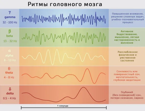 Гамма-ритм (от 35 до 100 колебаний в секунду, амплитуда – до 15 мкВ);