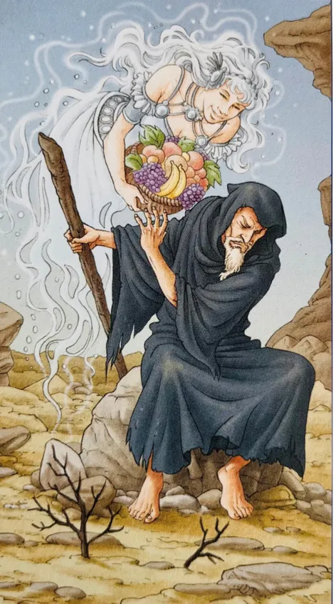 *На карте изображен старик-мудрец, он присел отдохнуть после долгого пути и тут ему, то ли в фантазиях, то ли во сне является добрая фея с роскошными угощениями. Но наш Отшельник отворачивается от протянутого ему изобилия, а фея улыбается и явно с добром к нему относится, но он хмурен и недоволен.