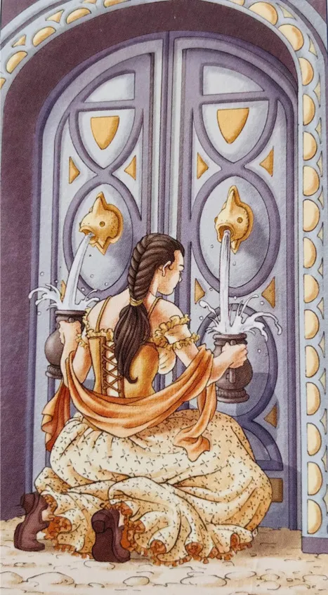 *На карте изображена девушка в красивом желтом платье, повернутая к нам спиной, с аккуратно заплетенной косой, она смиренно стоит на коленях и наполняет кувшины чистой водой. Дверь перед ней закрыта и все эти символы говорят нам, что дверь не откроется пока она не научится терпеливо относится к жизни и ничего не ускорять.
