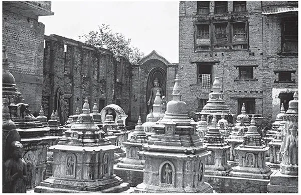 Уже из Катманду хорошо виден храм Сваямбху, стоящий на вершине пирамидального холма с тремя лестницами, крутые ступени которых ведут по склонам наверх между большими статуями Будд и бесчисленными ступами. Символическая форма ступ представляет пять видов мудрости, которые раскрываются при достижении состояния Будды; они присущи всем живым существам. На холме возвышается купол центральной ступы, оставшейся со времени Будды Осунга (на санскрите – Махакаша5). Этот просветленный действовал в нашем мире до Шакьямуни – Будды нашего исторического периода, чье учение мы применяем сегодня. Внушительное здание Сваямбху служит главной непальской резиденцией великого тибетского йогина Гьялвы Кармапы и первого хранителя его преемственности – Кюнзига Шамарпы. Оба этих учителя впоследствии приобрели для нас очень большое значение.