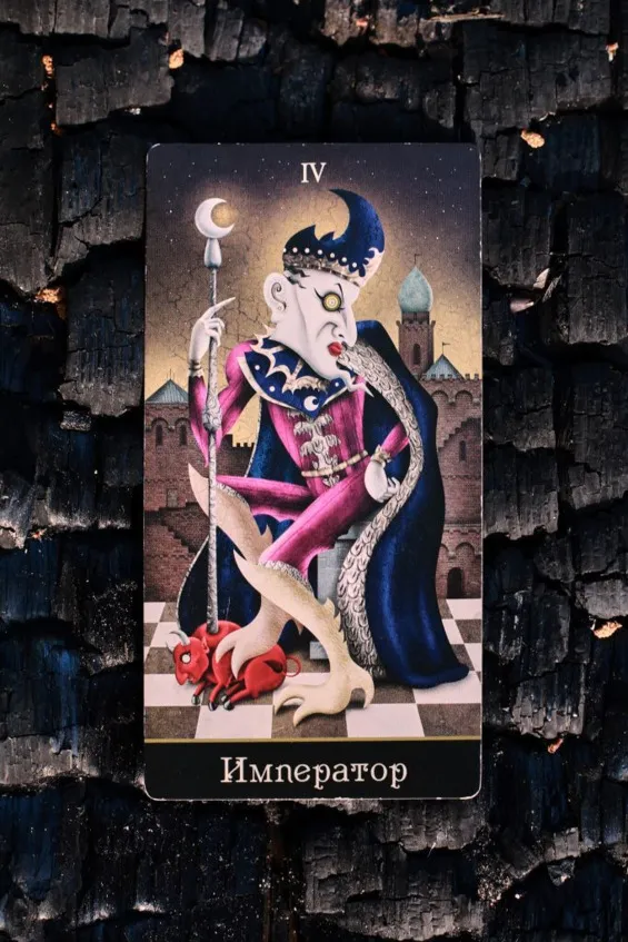 Обычно в большинстве колод Императрица изображается в расслабленной позе, здесь же мы видим ее в некой зажатости и скованности. Тот случай, когда человек не осознает всего своего потенциала и сам сдерживает себя и свои возможности.