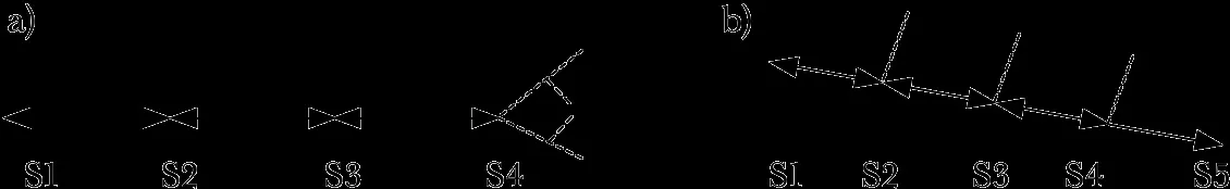 На рисунке b представлен другой вид построения фабулы в текстах закрытого типа. В них отправитель сообщения, то есть автор текста, предлагает читателю раз за разом предсказывать дальнейшее развитие сюжета, но каждый раз утверждает свое авторитарное право на то, как правильно читать этот текст. Примером такого построения могут служить все детективные романы.