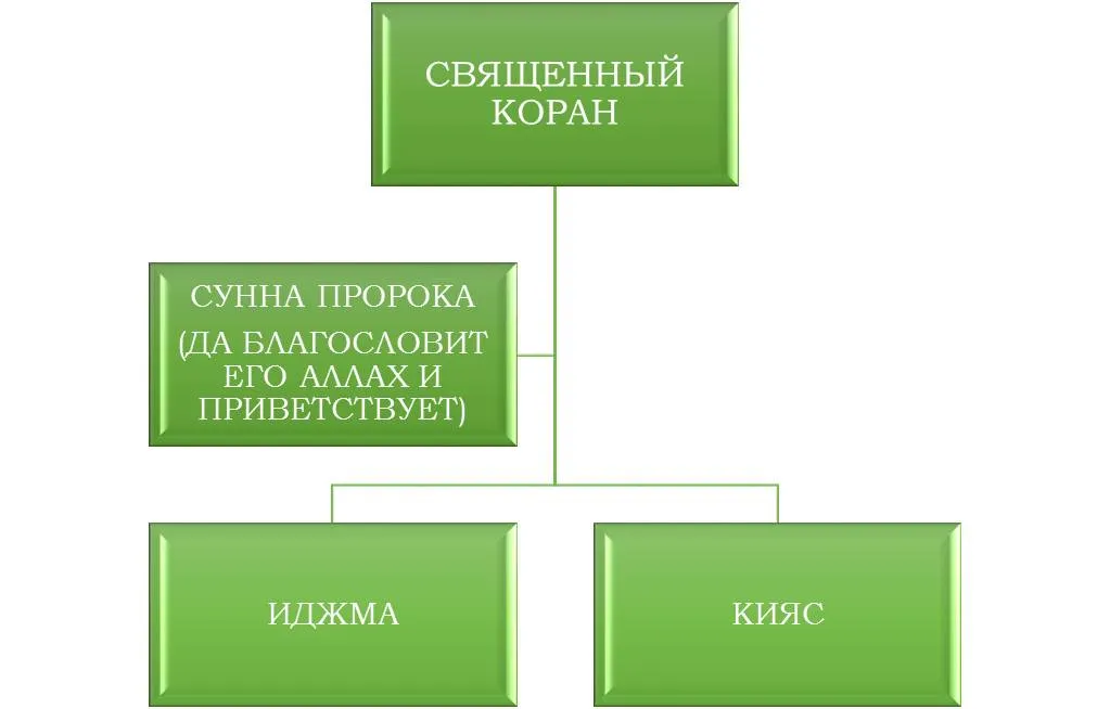 Система мусульманского права, как уже понятно из приведенных выше позиций и примеров, основана, в первую очередь, на Священном писании (книге) мусульман – Коране. Помимо Корана как главного источника мусульманского права другими также являются Сунна Посланника Мухаммада (да благословит его Аллах и приветствует), иджма и кияс. При этом Священный Коран и Сунна Пророка (да благословит его Аллах и приветствует) являются первичными (основными), а иджма и кияс – производными (второстепенными) источниками данной системы (см. рис. 2).