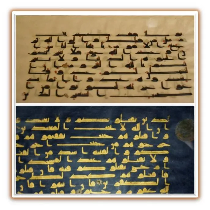 Рис. 5. Фрагменты пергаментных страниц Корана, выполненных каллиграфическим стилем письма – «куфи» и «восточный куфи», IX-XI вв. (The David Collection, Копенгаген, источники фото: https://en.wikipedia.org/wiki/Blue_Qur%27an)