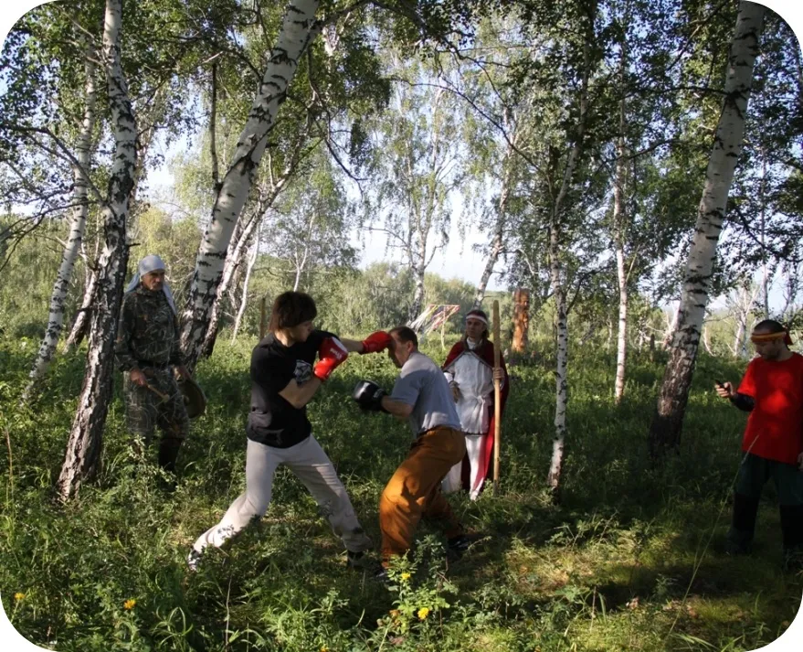 Вторая тренировка была за неделю до ритуала – 17 июля. На следующий день после очередного занятия-матепития с Виталием группового. Рано утром на месте предполагаемого проведения ритуала (холмы на Южной). Планировалась моя тренировка с Юрой, ну и с Вовой. Рано утром за мной заехал Юра с Натальей и Мариной, мы все заехали за Виталей, а Вова с Юлей подъехали уже к месту. К тому дню я купил себе здоровские Перуновские перчатки – кожаные, красно-белые. Они прямо сами меня нашли. Зашёл в магазин, выбрал одни, парень-продавец пошёл на склад и принёс другие, возьми их, говорит, всего на 100 рублей дороже, но гораздо лучше. Это и были те самые перчатки, причём на витрине-то их не было. И вообще, скажу, что, чем ближе к бою, тем больше было таких моментов-проблесков ТОЙ реальности «бело-огненной средины бытия», света от тех полей, тех равнин. И он утоньшался, такой тонкой тянущей-тягучей негой заливал жизнь, ощущение почти неописуемое. Оно иногда возникает, когда смотришь на свои старые фотографии, где те места, которых больше уже нет, те люди, дома, вещи. Они и есть, и нет. Тонкая серебристая струна протянута между «есть» и «нет», и её звон – и есть эта тягучая нега. Границы миров переставали быть на замке.