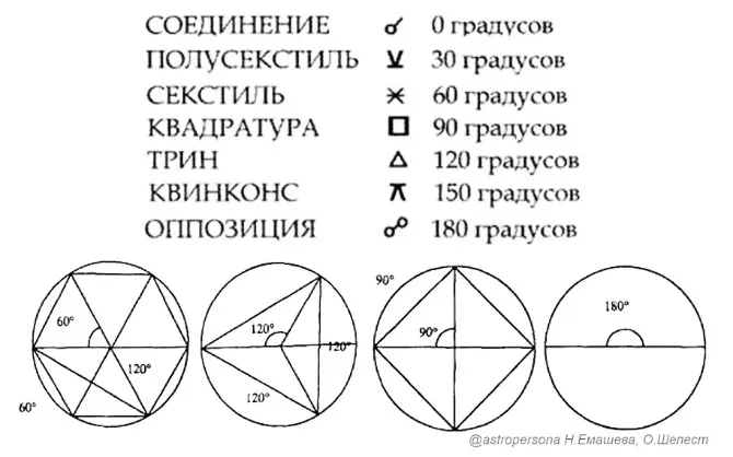 1. Соединение – планеты имеют одну долготу на зодиакальном круге с допуском +/– 6 градусов.