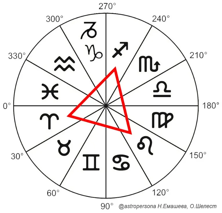 Большой Тригон включает планеты, расположенные в одной стихии. Это равносторонний треугольник, он олицетворяет устойчивость. Человек удачлив, легко достигает цели, если отсутствуют напряженные аспекты. Даже при их наличии человек, все равно, способен достичь стабильности в жизни, но не так легко и быстро.