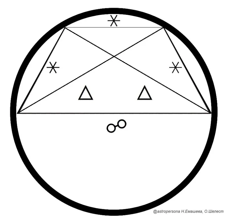 Проявление планеты в вершине треугольника включает секстиль, питая своей энергией планеты, находящиеся в основании. Это очень мягкая, ненавязчивая по своему действию конфигурация, приносящая удовлетворение и блага человеку.