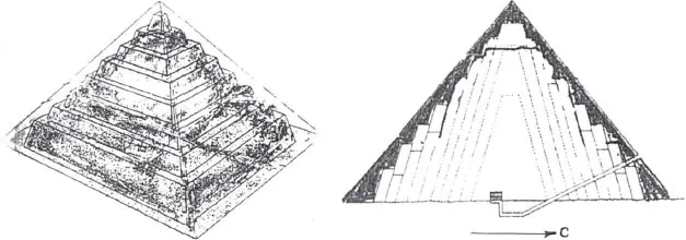 С воцарением фараона Снофру (2639–2604 гг. до н. э.), основателя IV династии, произошел переворот в строении пирамид. В районе Мейдума (рис. 17) была построена восьмиступенчатая пирамида, в которой уступы заполнили каменной кладкой и облицевали блоками белого известняка. Пирамида стала гладкой, высотой около 110 м и стороной основания 146 м (рис. 54).