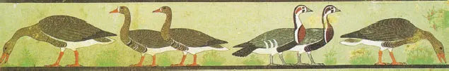 В полукилометре от Медумской пирамиды обнаружили мастабу принца Нефер—Маата и его жены Итет с изумительной картиной с гусями (рис. 57)