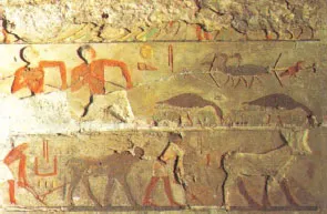 На стенах погребальной камеры роспись с животными и охотящимися на них людьми (рис. 58). Картины выполнены с использованием инкрустаций из стекловидной эмали. Эти шедевры изобразительного искусства выставлены в Каирском музее.