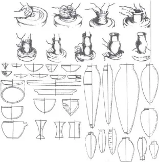 Горшечник разбивал кусок сухой глины, растирал и просеивал, удалял мелкие камешки, затем добавлял песок и замешивал глиняное тесто. В основном применялся гончарный круг, где левой рукой мастер вращал его, а правой лепил сосуд. Глина принимала форму пузатого горшка или чашки, миски или кубка, кувшина с заостренным или плоским дном. На рис. 11 представлены типы гончарных изделий, изготовленных на круге и обожженных в печах (рис 12).