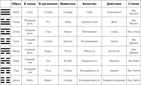 Как видно из табл. 1, непрерывные три параллельные линии обозначат первую триграмму, обозначающие образ «Небо», качество – «Сила», и стихию – «Янь Металл». Иногда в литературе уточняют, что металл красновато-желтый или золотистый.