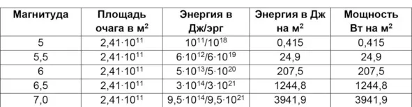 Таблица 8. Соответствие магнитуды, энергии и мощности для случая подсчета по площади тектонических разломов в Египте