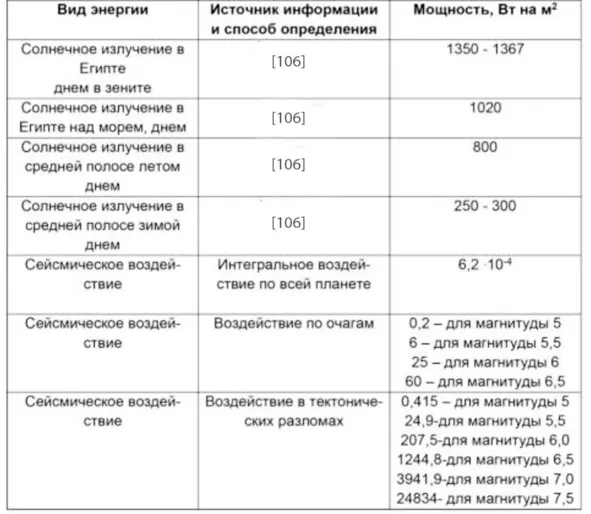 Огромная мощность выделяется при магнитуде в 7,0 и 7,5, то есть при состоянии землетрясения. В обычном состоянии во всех сейсмически опасных местах средняя сейсмичность меньше и для области сильной активности магнитуда может составлять в диапазоне от 5,5 до 6. Из табл. 6 можно найти, что для такой магнитуды землетрясений, конечно, нет, но почва вибрирует под действием мощности от 24,9 до 207,5 Вт/м2.