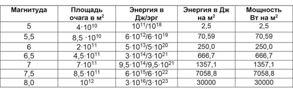 Таблица 14. Соответствие магнитуды, энергии и мощности для случая подсчета по величине очага сейсмической активности в Мексике.