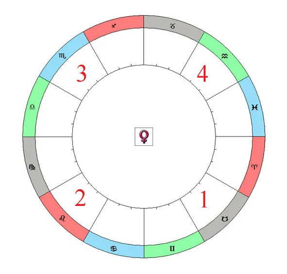 В Кресте, как это представлено на рис.027, мы видим, что относящийся к Стихии Огня Зодиакальный знак Льва является местом Экзальтации Венеры, а местом Падения является Зодиакальный знак Водолея, относящийся к Стихии Воздуха.